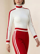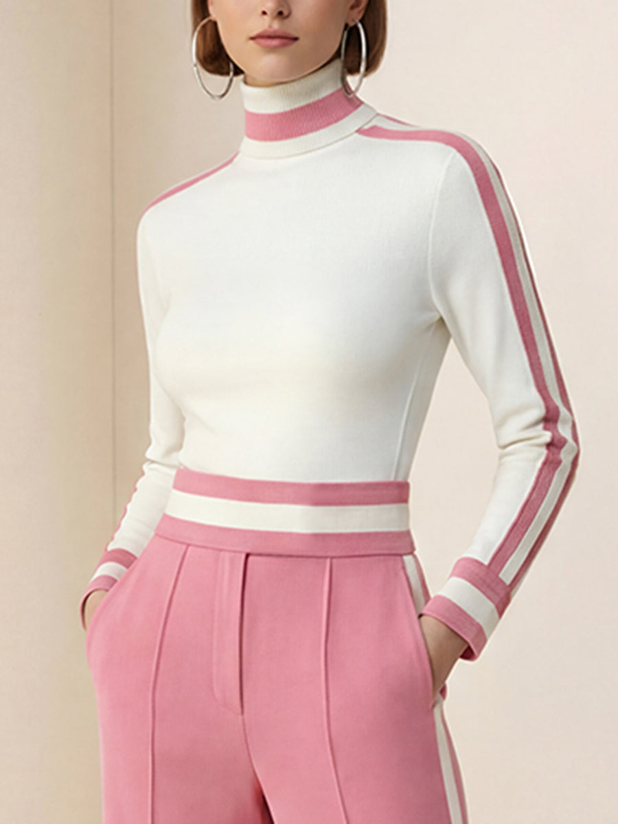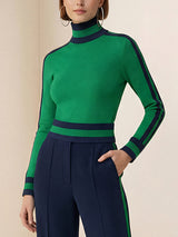 Long Sleeves Skinny Contrast Color Split-Joint Striped High Neck T-Shirts Tops