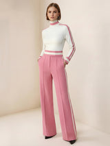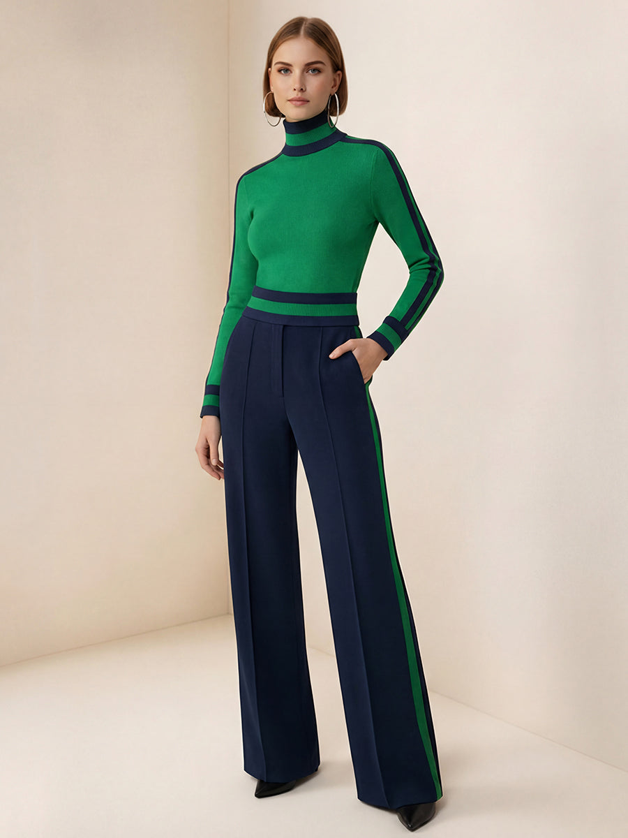 The high-neck knitted silhouette is a neat and confident look in the workplace. The red and green contrasting woven straps flow along the shoulder line, waist line and the seams of the pants, as if sewing the speed of retro racing cars into daily life, relaxed yet energetic.
