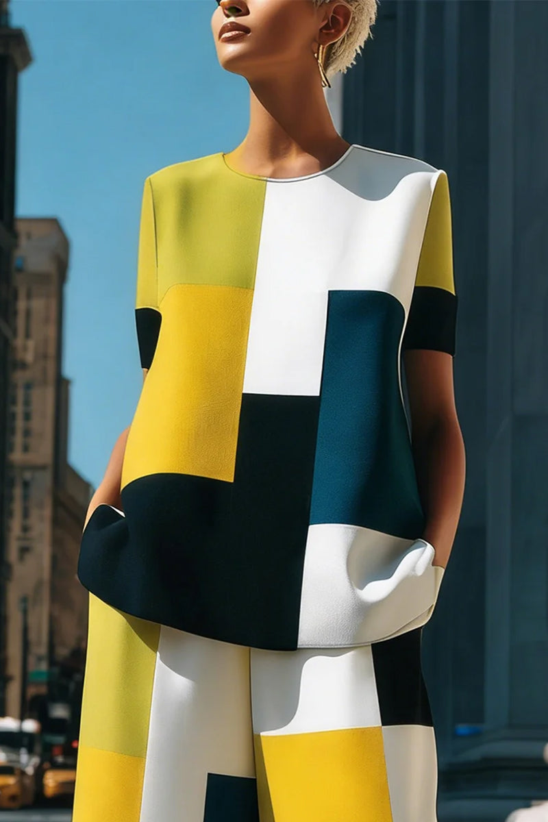 Loose Short Sleeves Contrast Color Split-Joint Round-Neck Blouses&Shirts Tops