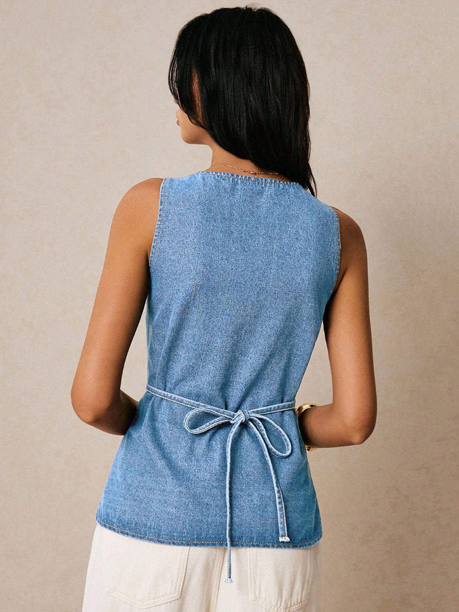 Sleeveless Buttoned Solid Color Tied Waist Square-Neck Vest Top
